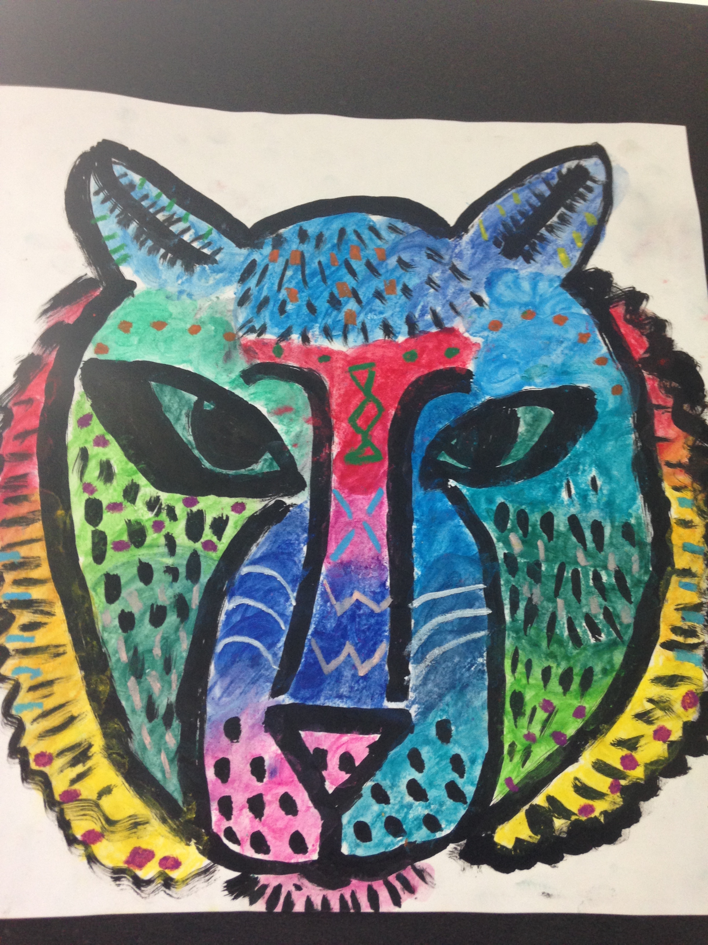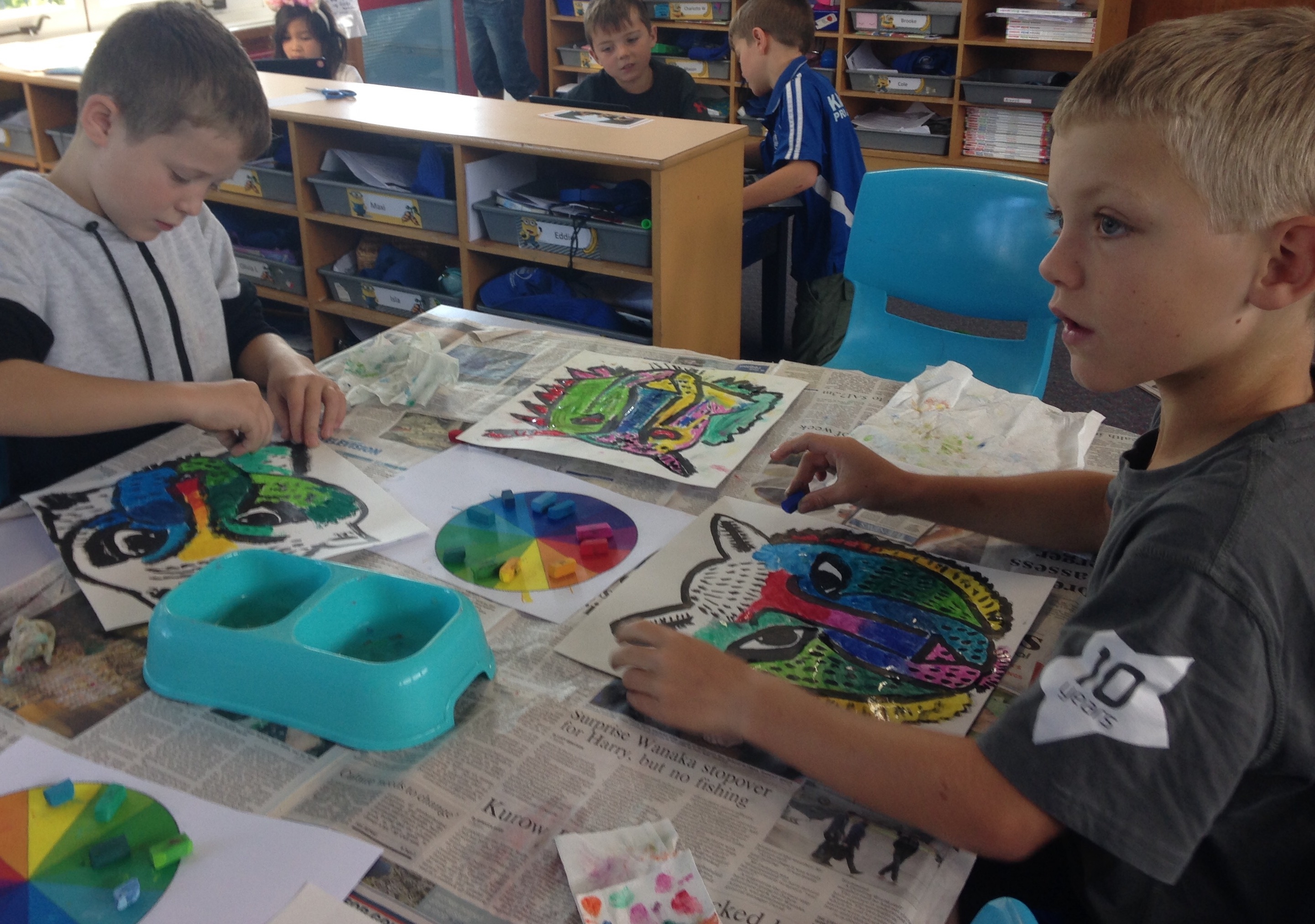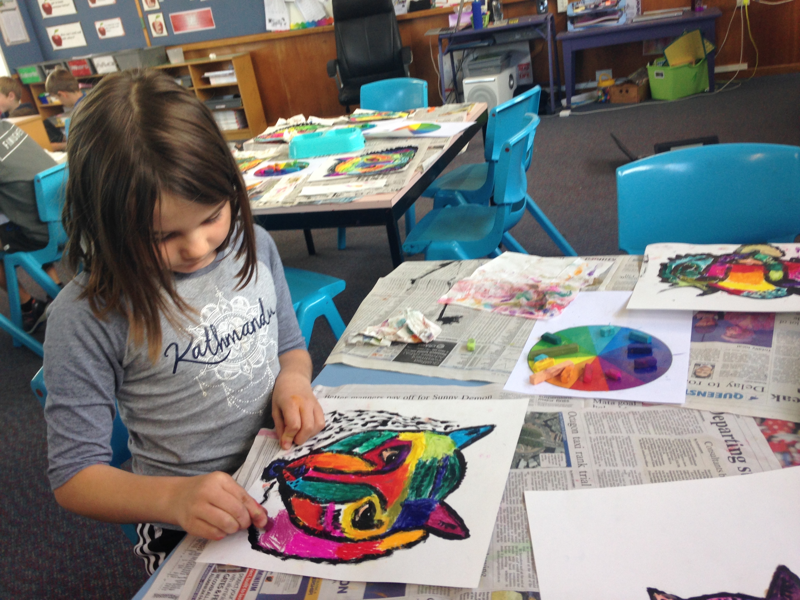 You may have been into Room 3 and seen the amazing tigers hanging from the ceiling. The tigers were inspired by an amazing artist called Dean Russo. First of all we used indian ink to draw the outline of our tigers. We then used bright chalk pastels. We had to choose analogous colours (colours that are beside each other on the colour wheel) when colouring a section . After we chalked our art we used starch paste to mix the colours and hold the chalk in place. The final step was to use oil pastels to draw patterns on top of our tigers. They look amazing!