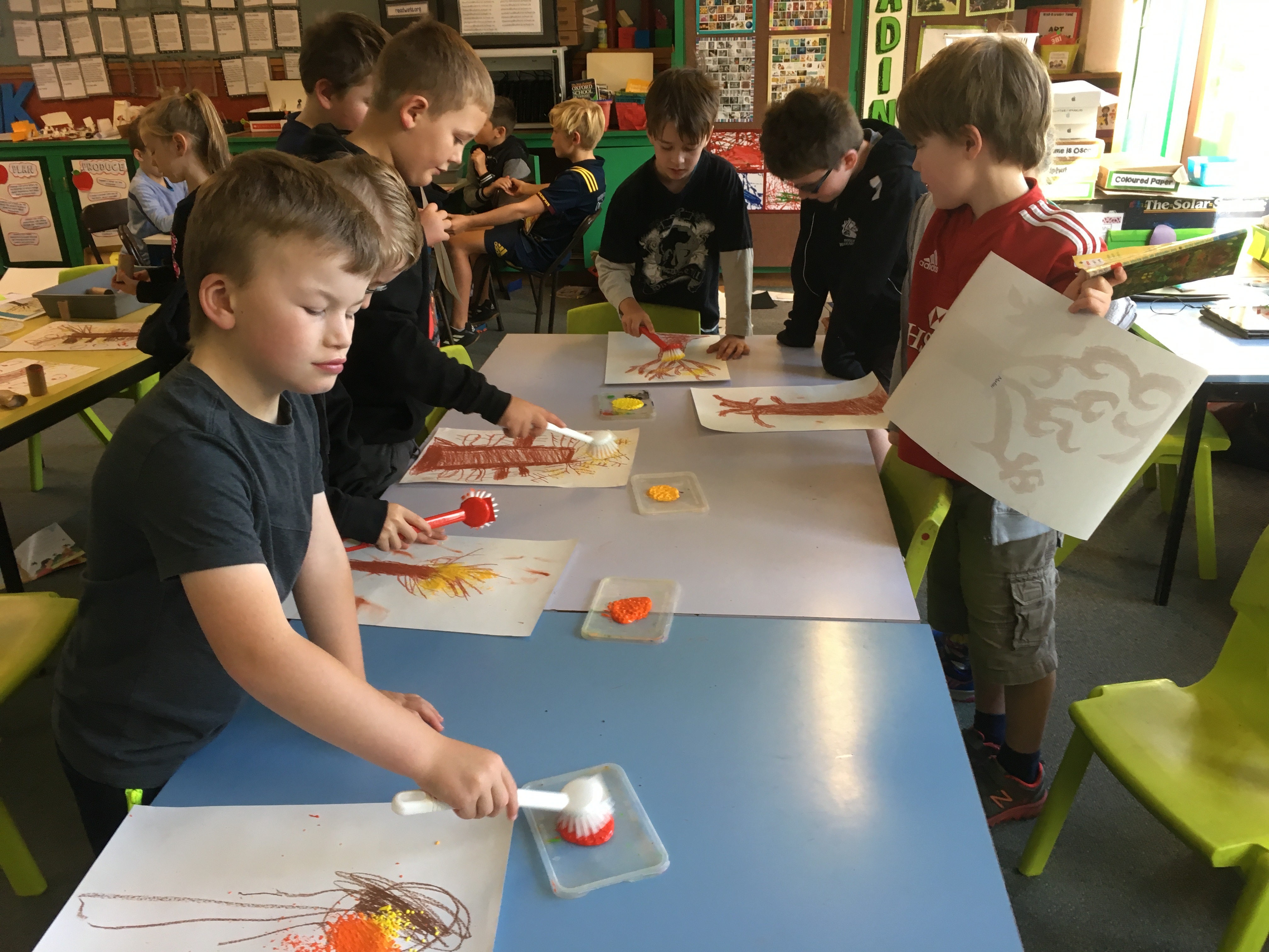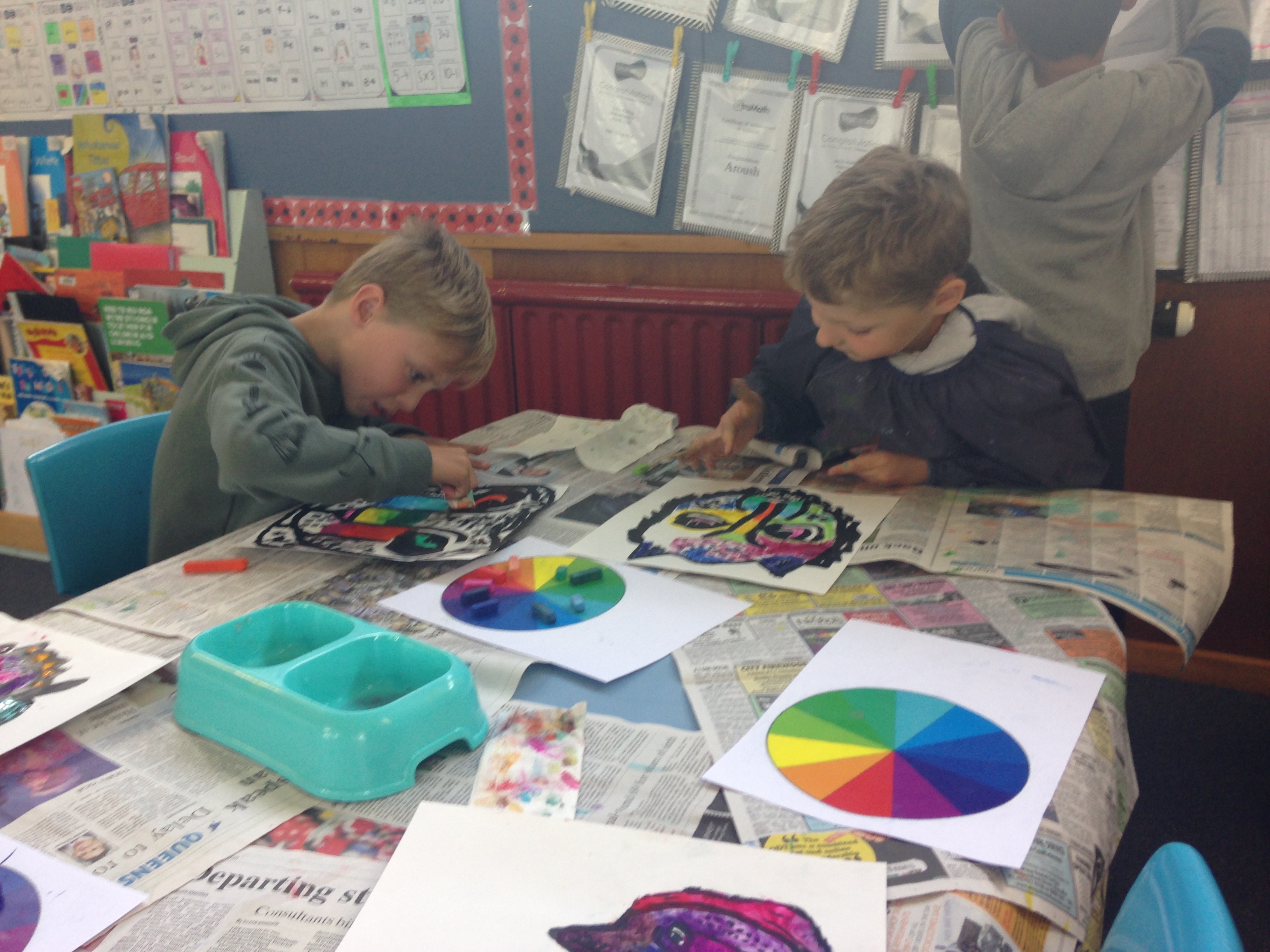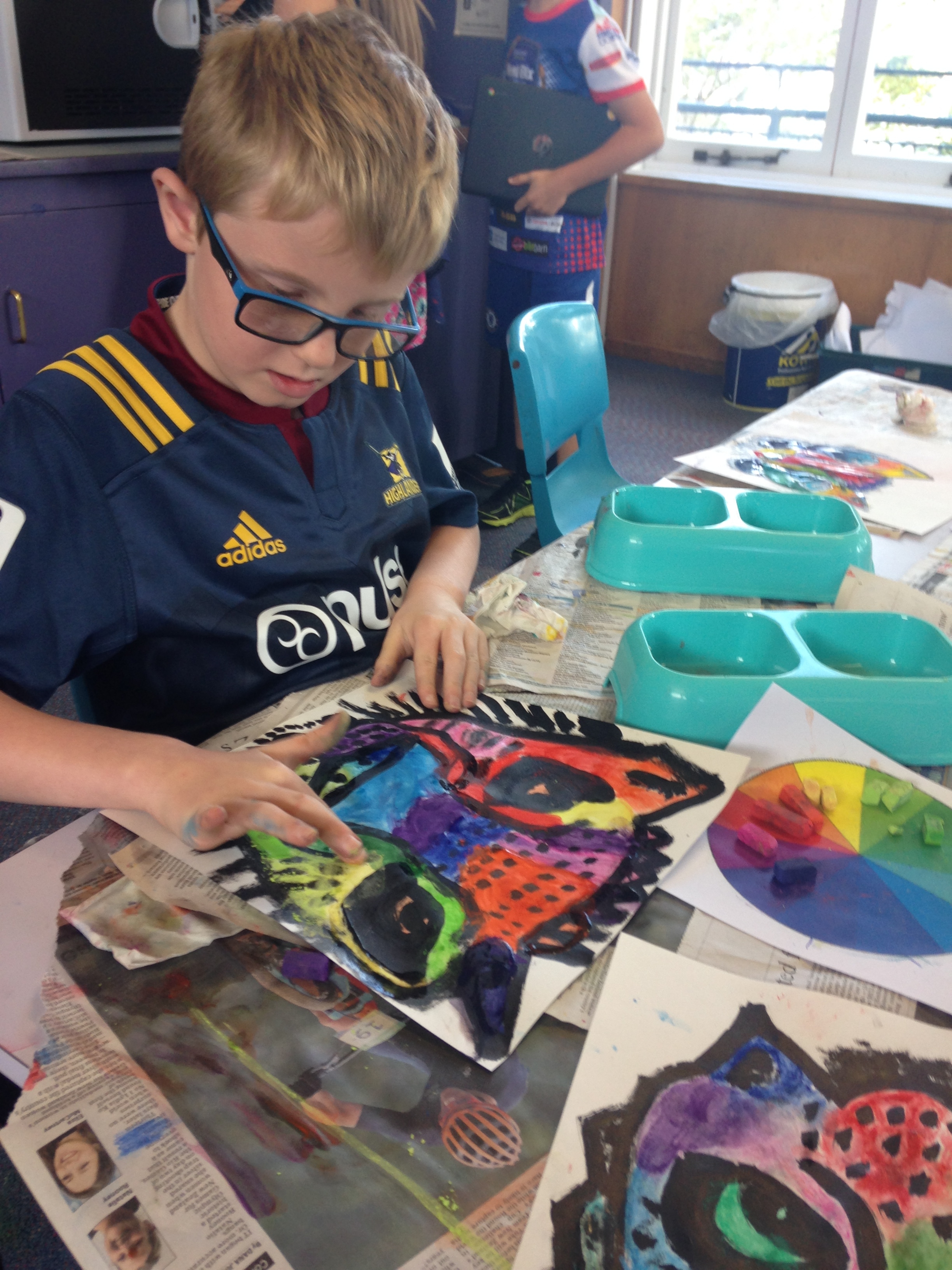 You may have been into Room 3 and seen the amazing tigers hanging from the ceiling. The tigers were inspired by an amazing artist called Dean Russo. First of all we used indian ink to draw the outline of our tigers. We then used bright chalk pastels. We had to choose analogous colours (colours that are beside each other on the colour wheel) when colouring a section . After we chalked our art we used starch paste to mix the colours and hold the chalk in place. The final step was to use oil pastels to draw patterns on top of our tigers. They look amazing!