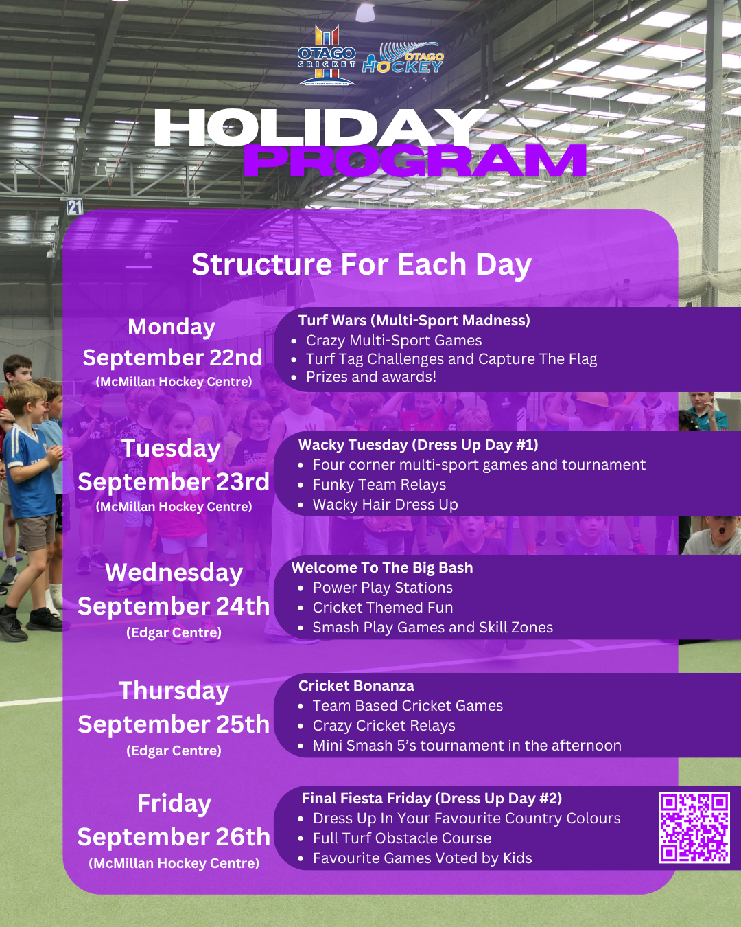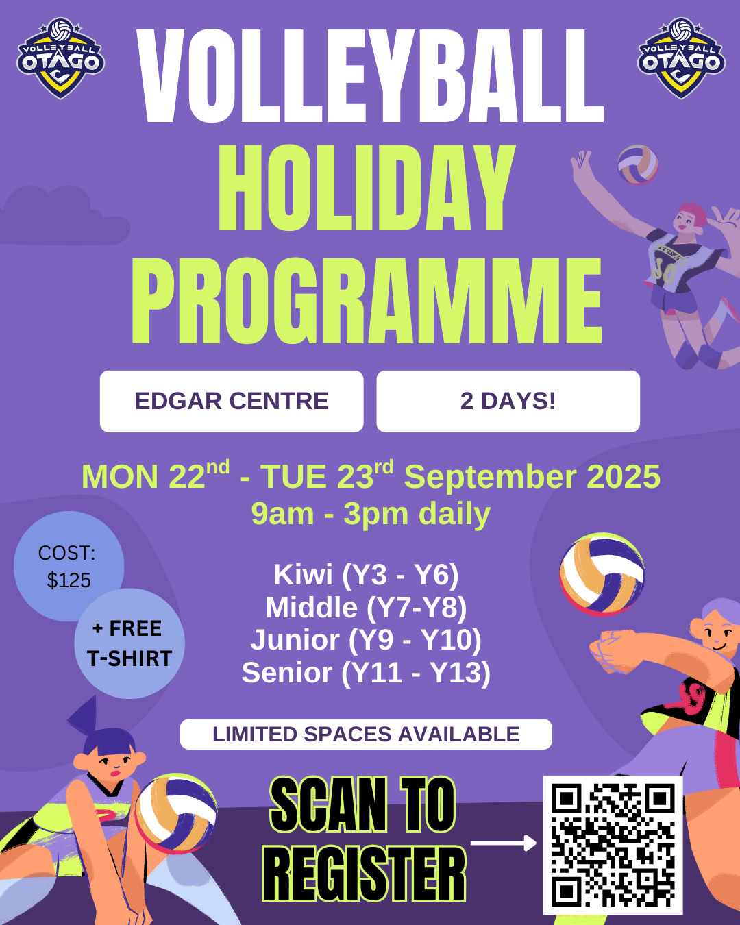 Volleyball Otago is excited to be running our second ever holiday programme at the Edgar Centre on the 22nd and 23rd of September. This programme is open to all students from Year 3 through to Year 13 and welcomes players of all skill levels. Individuals can either use the QR code or the following link to get further registration information: https://www.sporty.co.nz/viewform/364008