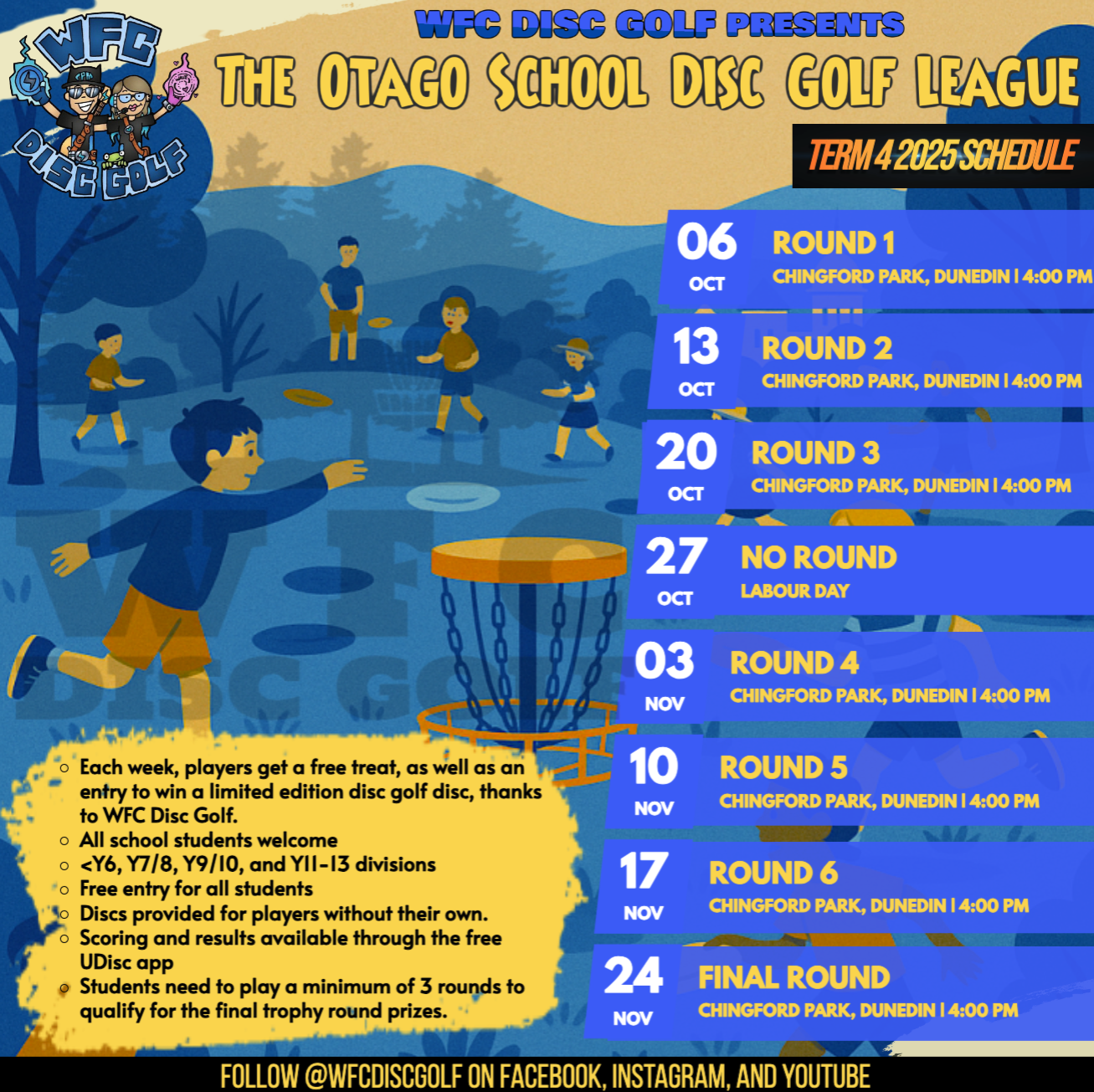 A weekly, after-school disc golf league hosted by WFC Disc Golf, open to all Otago-based students in Years 1β13. Whether theyβre total beginners or already throwing like pros β all are welcome!