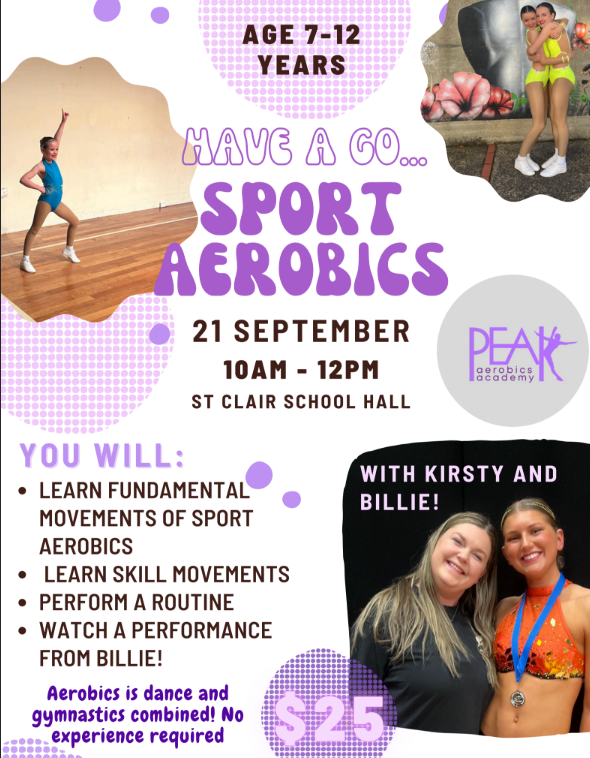 A fun aerobics βhave-a-goβ workshop Sunday 21st September, 10amβ12pm at St Clair School Hall.