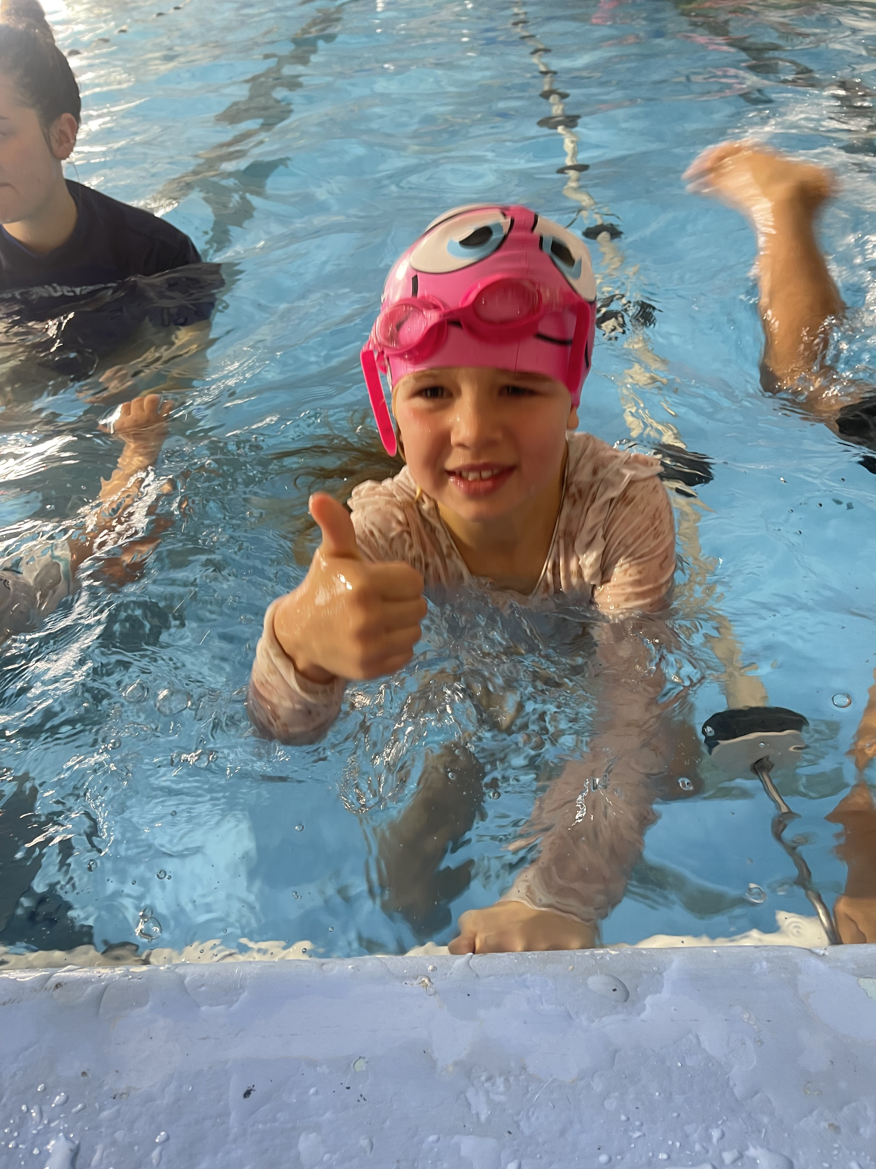 I am in my togs. I am in the pool. I am kicking.