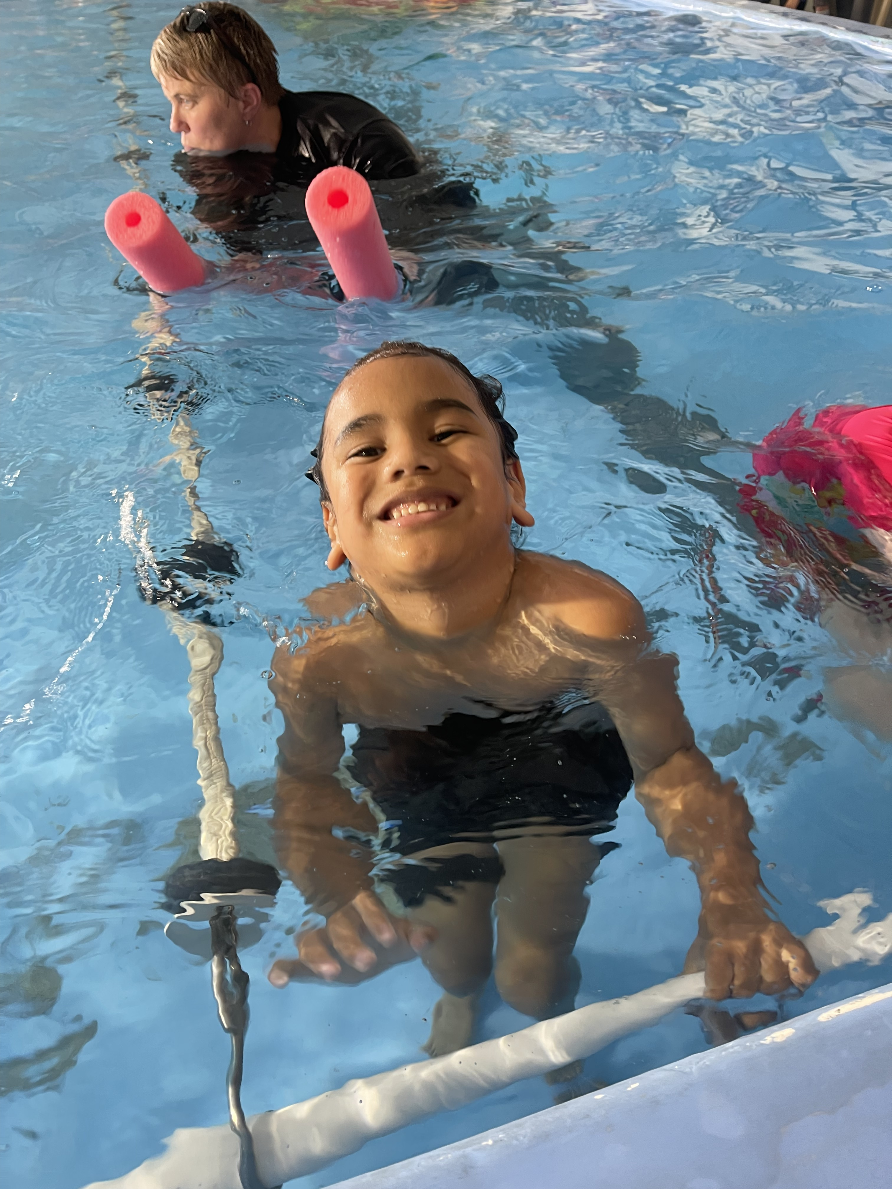 I am swimming. I am in my togs. I am kicking. I am having fun.