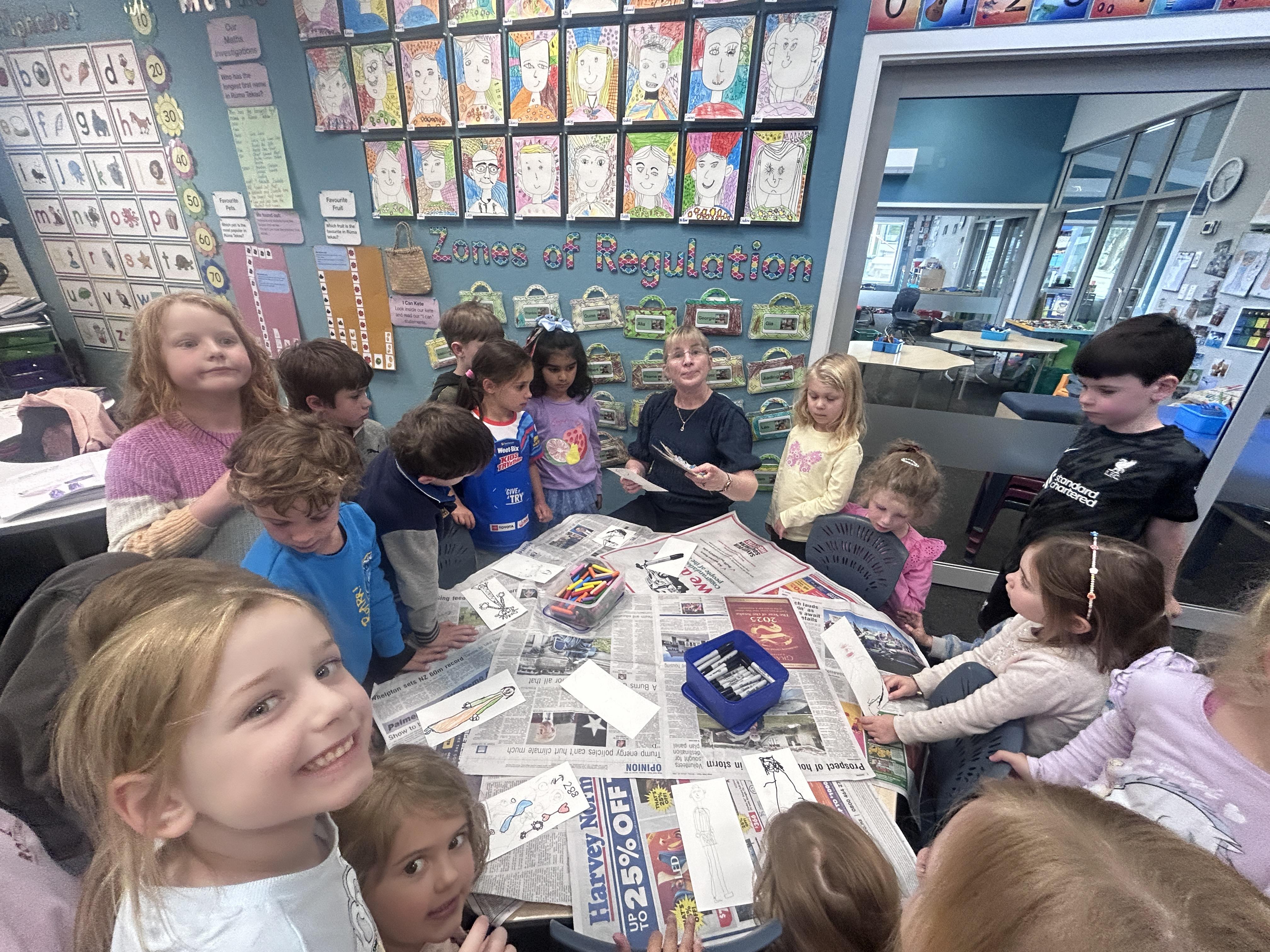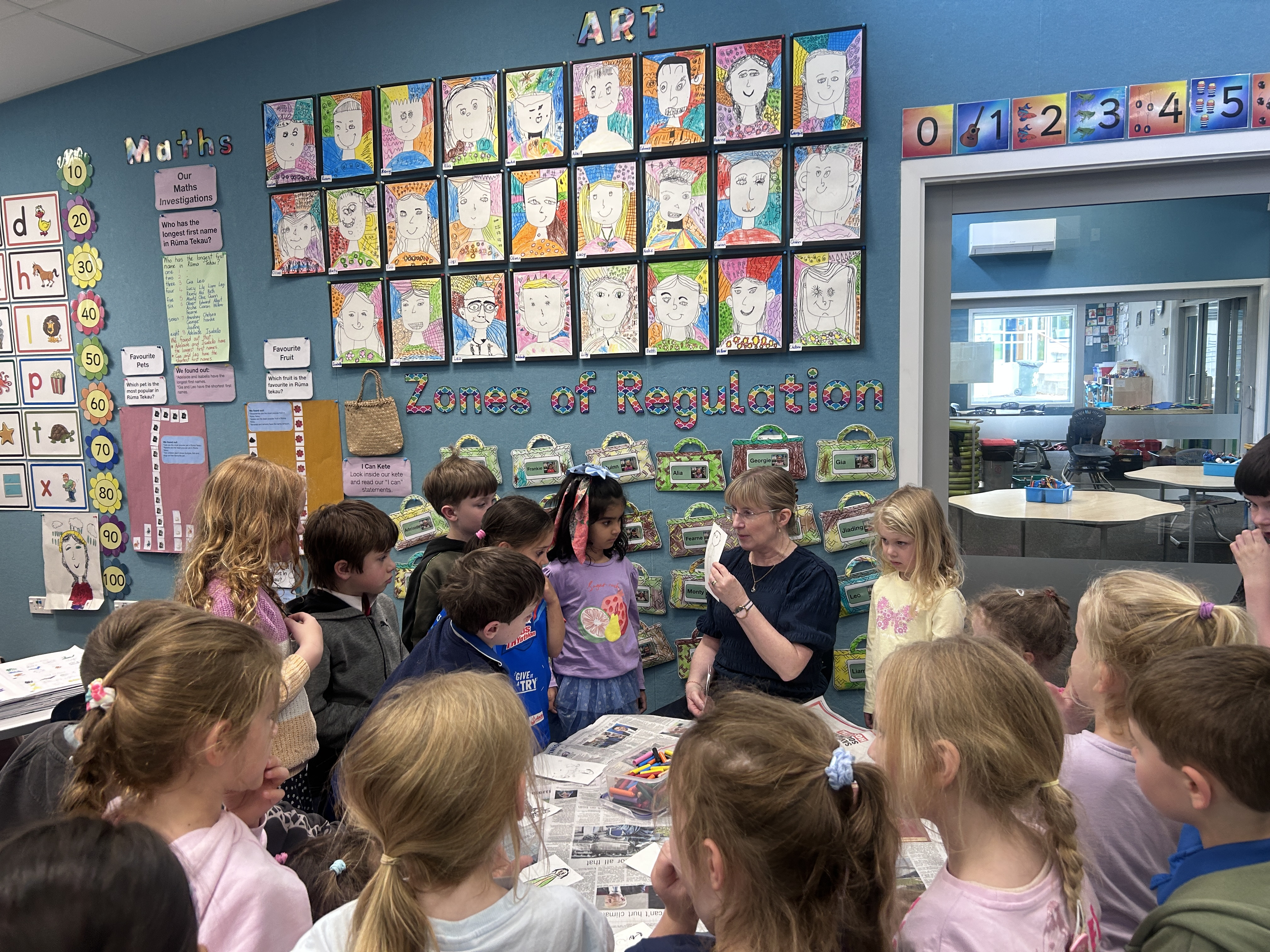 We also have engaged with Alice the Artist to paint a mural by Rooms 12 and 13. Alice and I have been working to create some concepts based on children's artwork relating to our community and environment, such as rivers, native birds, the Kaikorai stream, and Rākaihautū.