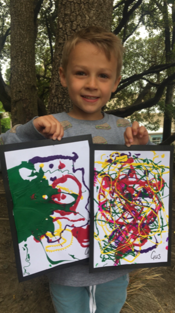 We have been making splatter art. We squeezed paint out of bottles. It was really funny because when it came out it sounded like farts! By Gus
