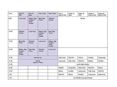Timetable: All children will be bused to the Caledonian at 9:15 a.m., with the first events beginning at 9:50 a.m. Junior children will return to school by bus at 12:30 p.m., and the Seniors and Middles will return at 2:30 p.m.