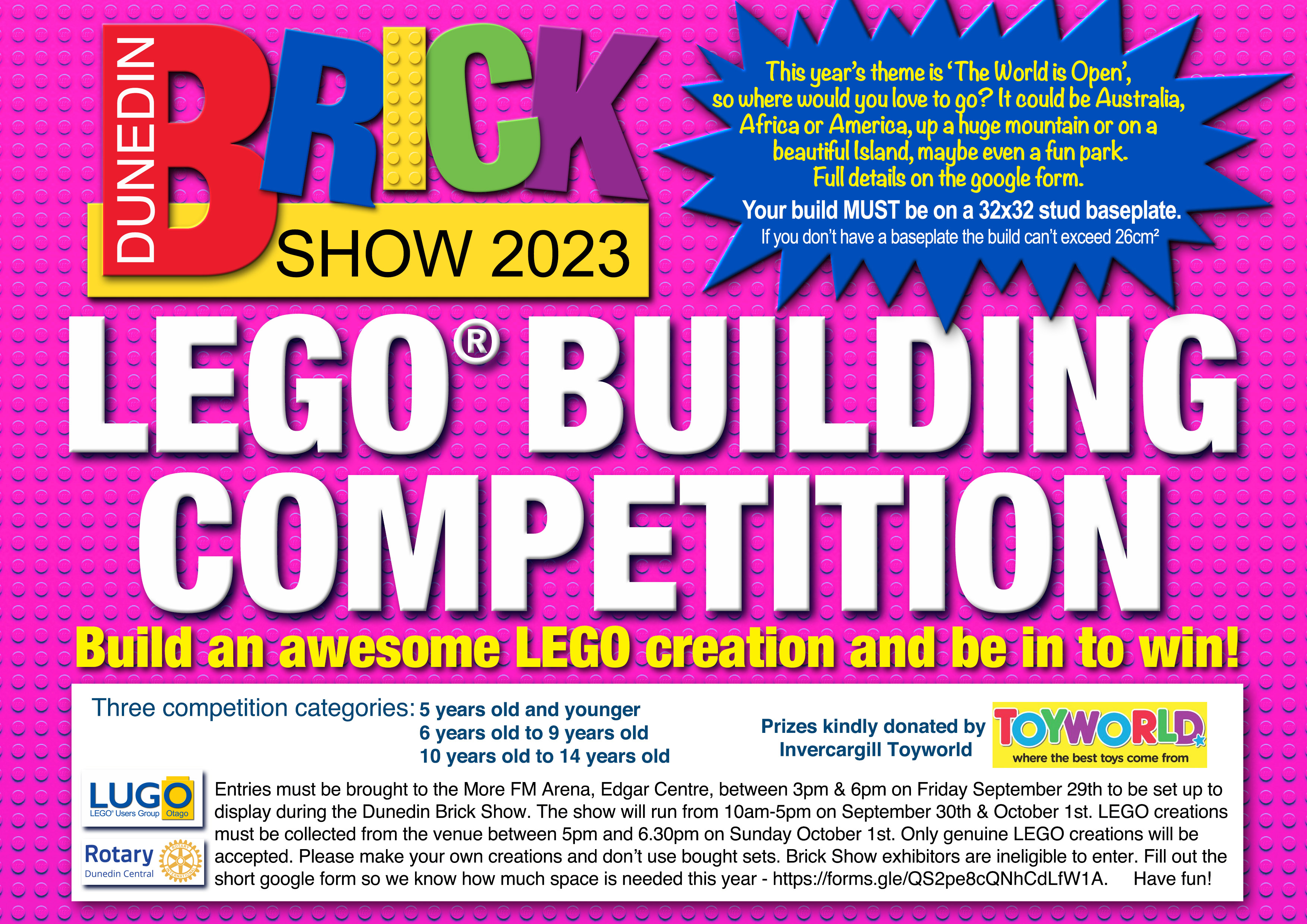 The Dunedin Brick Show is a very popular event for children of all ages. We would love to see children of all ages enjoying themselves creating with LEGO, admiring the fantastic LEGO displays and entering the competitions that are attached. The show is being held at the MoreFM Arena, Edgar Centre, on September 30th and October 1st.