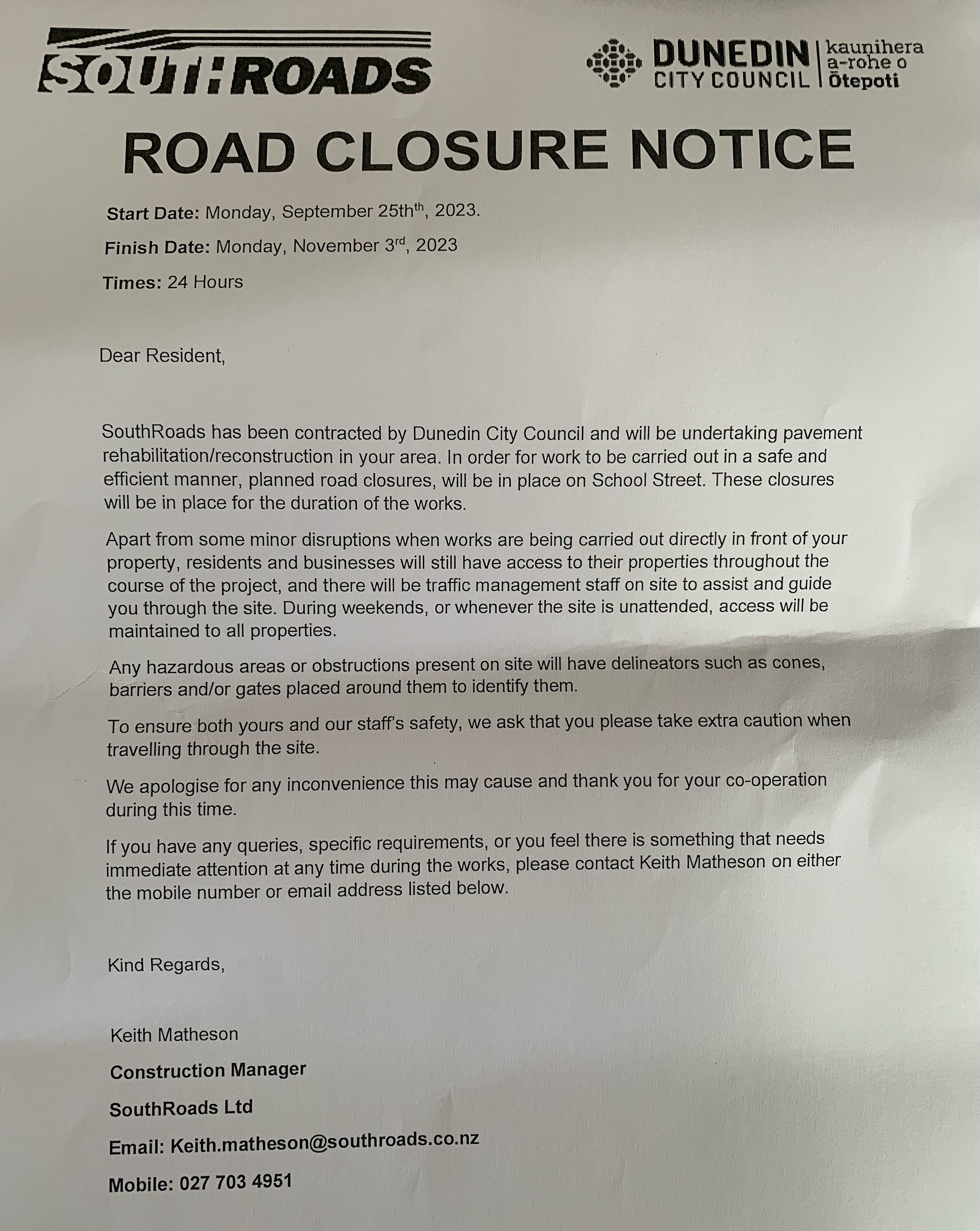 School Street Road closure