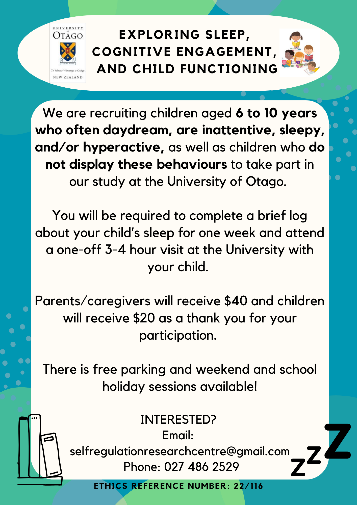 We are currently seeking children aged 6-10 years who often daydream, are inattentive, sleepy, and/or hyperactive, as well as children who do not display these behaviours to take part in our study. As part of our study, parents/guardians are required to complete a brief log about their child's sleep for one week and attend a one-off 3–4-hour session at the University with their child. These sessions are primarily held in the weekends and school holidays. With parental consent, their child's teacher will also be contacted to see whether they are willing to complete brief questionnaires about the child's functioning at school, as well as for a trained postgraduate student to conduct a brief observation in their classroom.