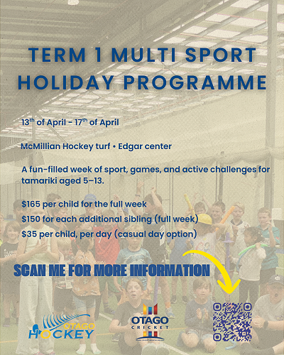 Otago Cricket is running a Term 1 Multi-Sport Holiday Programme from Monday 13th – Friday 17th April for children aged 5–13. The programme includes a fun-filled week of sport, games, and active challenges across McMillan Hockey Turf and the Edgar Centre.
