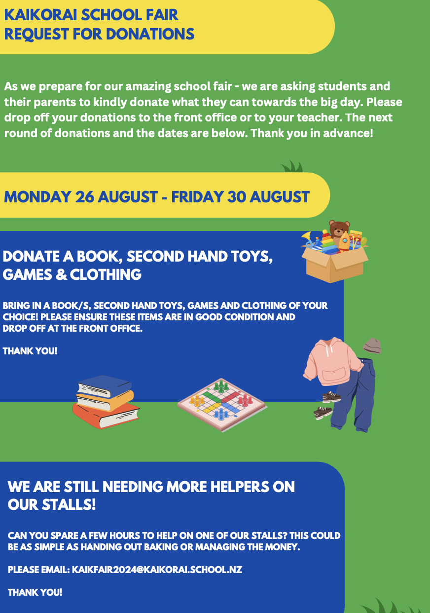Thank you for all the donations so far. Email kaikfair2024@kaikorai.school.nz to help.