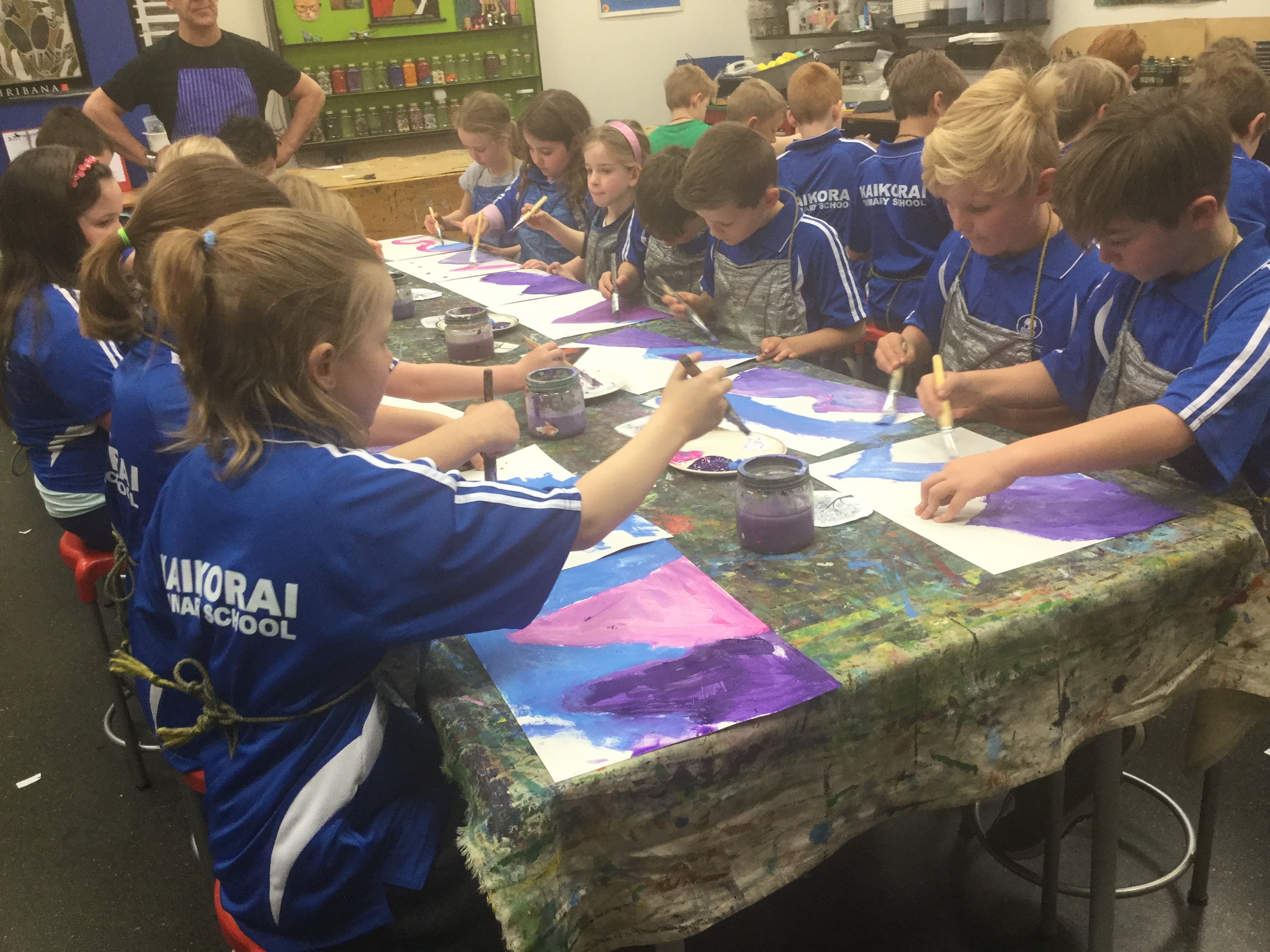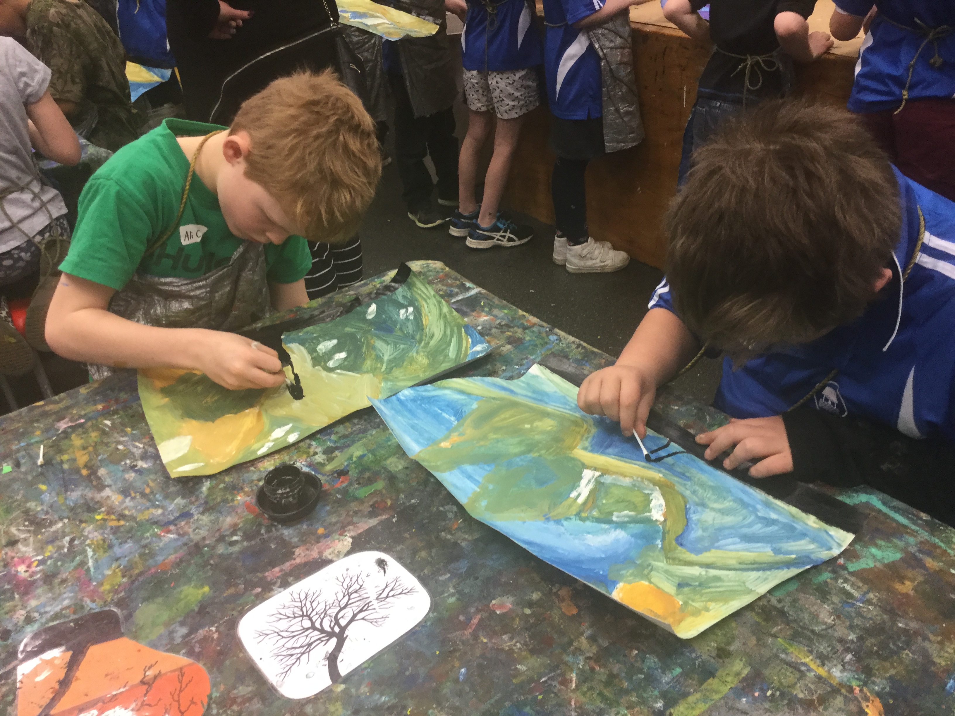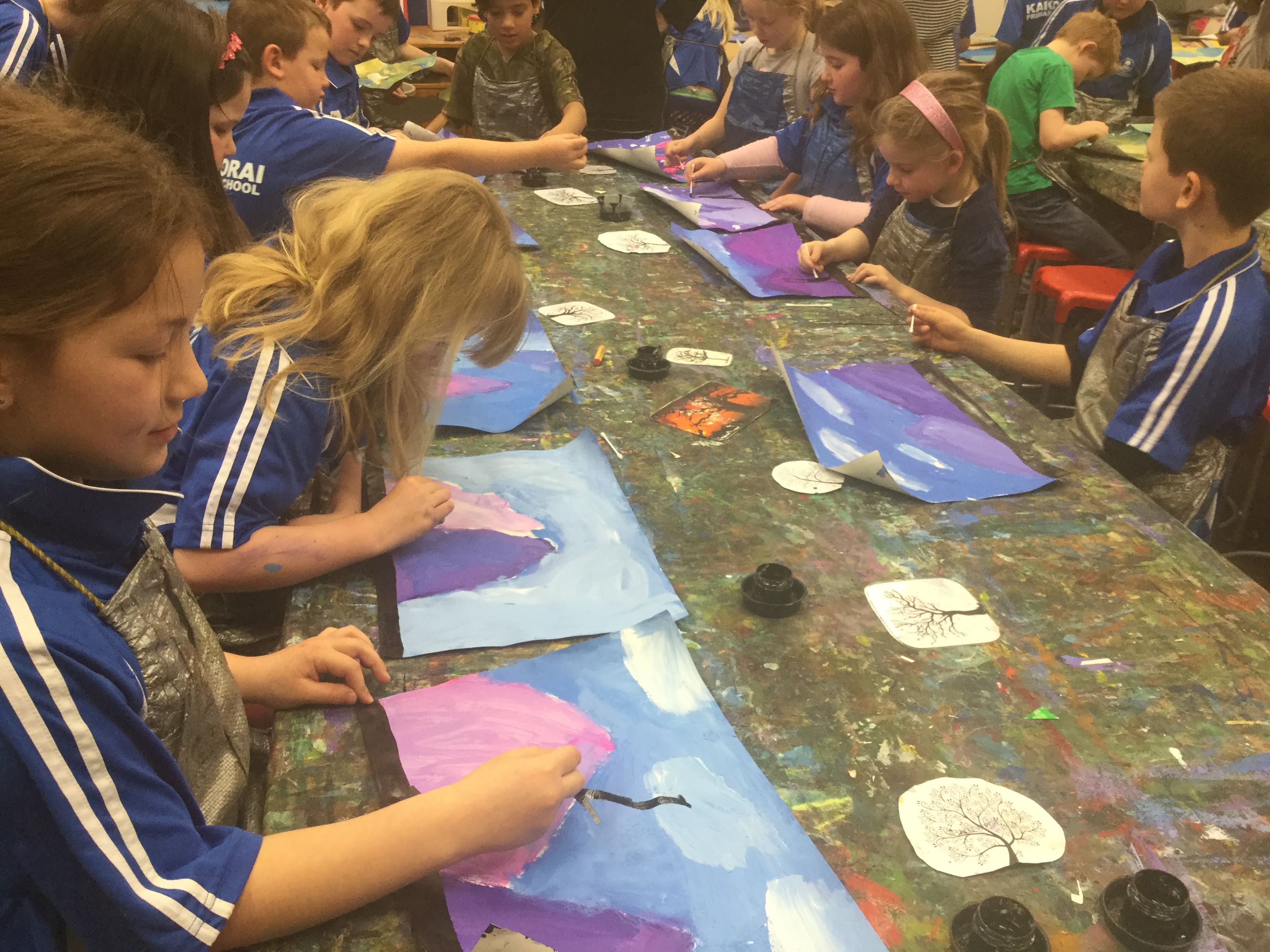 Room 6 had a fun time creating trees and landscapes at the art gallery. There were many opportunities to discuss the way different artists create a piece of art. We have also created some colourful artworks of the sons of Rangi and Papa using pastel and dye. Some children have also been creating some storyboards to retell the story, and will then begin looking at how to make a short movie from it.