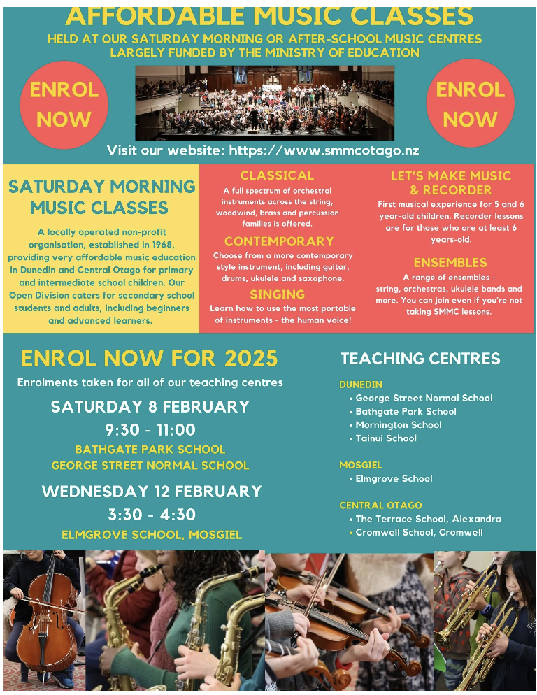 Please use our enrolment forms https://www.smmcotago.nz/enrol or contact our team to discuss lessons and instrument hire https://www.smmcotago.nz/contact