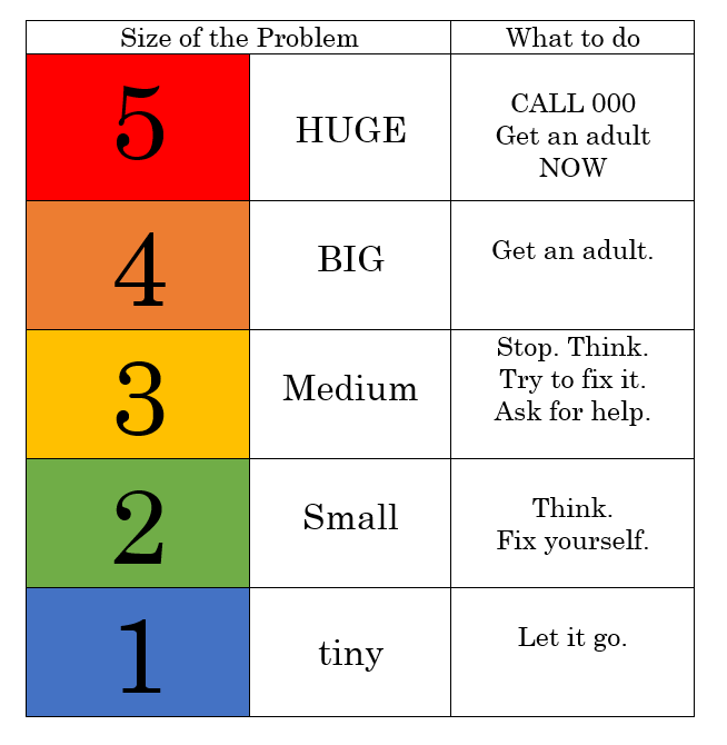 This website has a simple activity you could do with your child at home to help them understand the size of their problem. All classes have also implemented a metaphorical object to help students identify the size of the problem. It might be an ice cream cone with 1, 2 or 3 scoops, or a minnow, clown fish, whale example. Encourage your child to come up with their own way to identify the size of the problem they are experiencing.