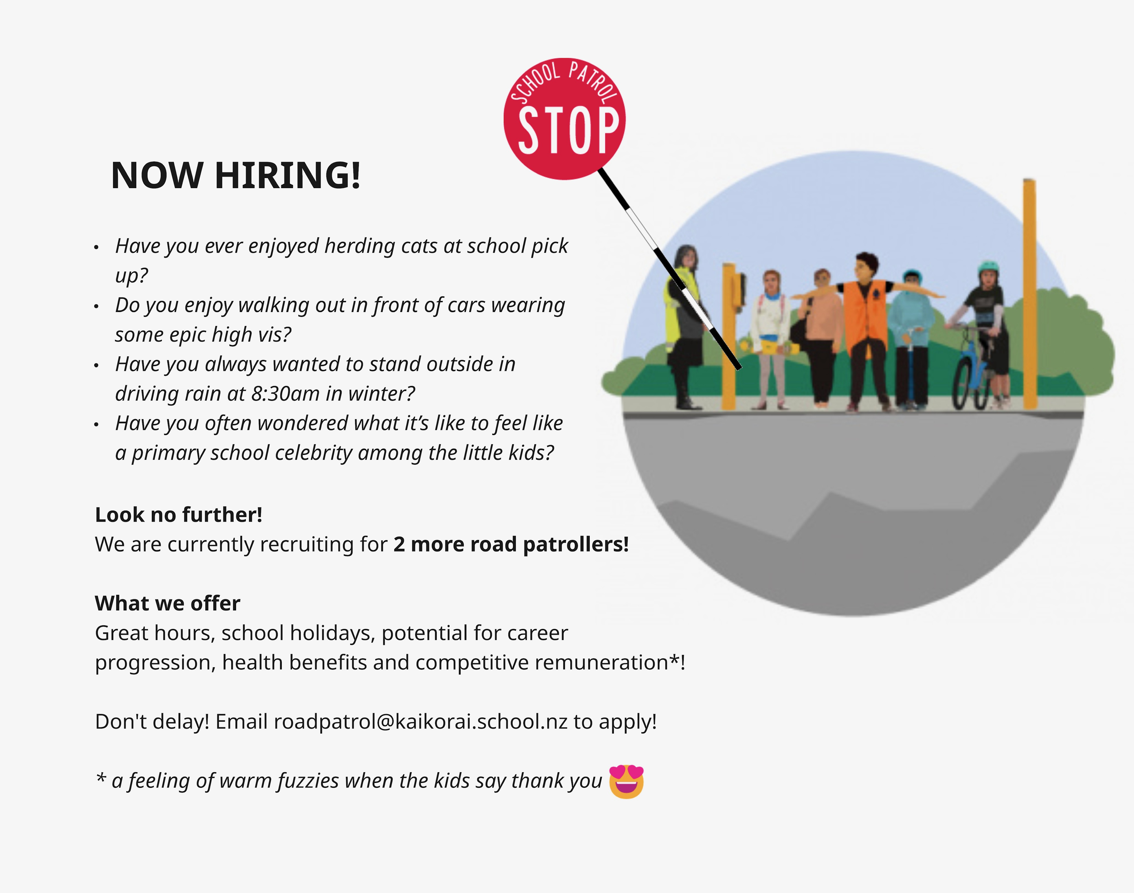 Please email roadpatrol@kaikorai.school.nz