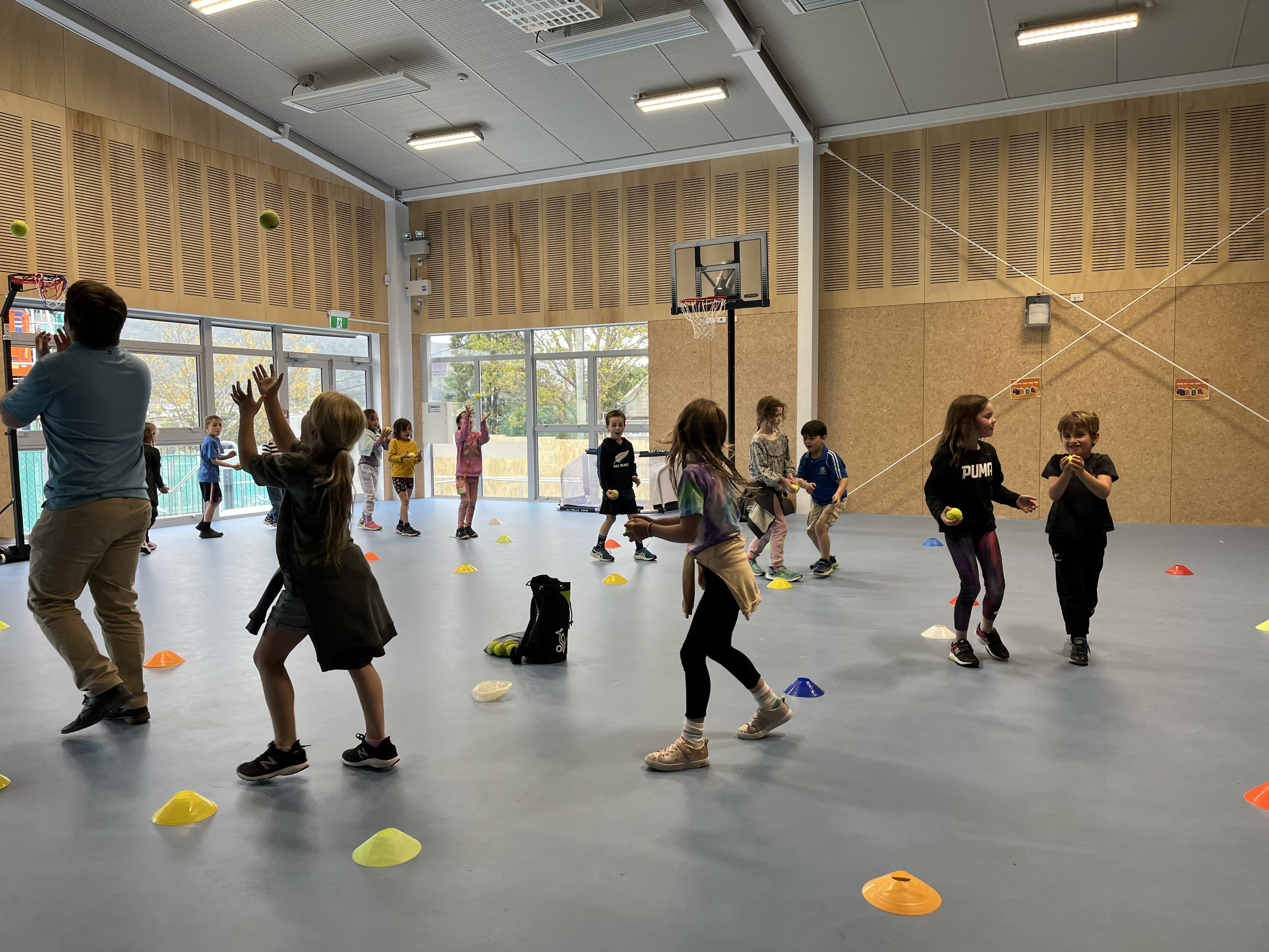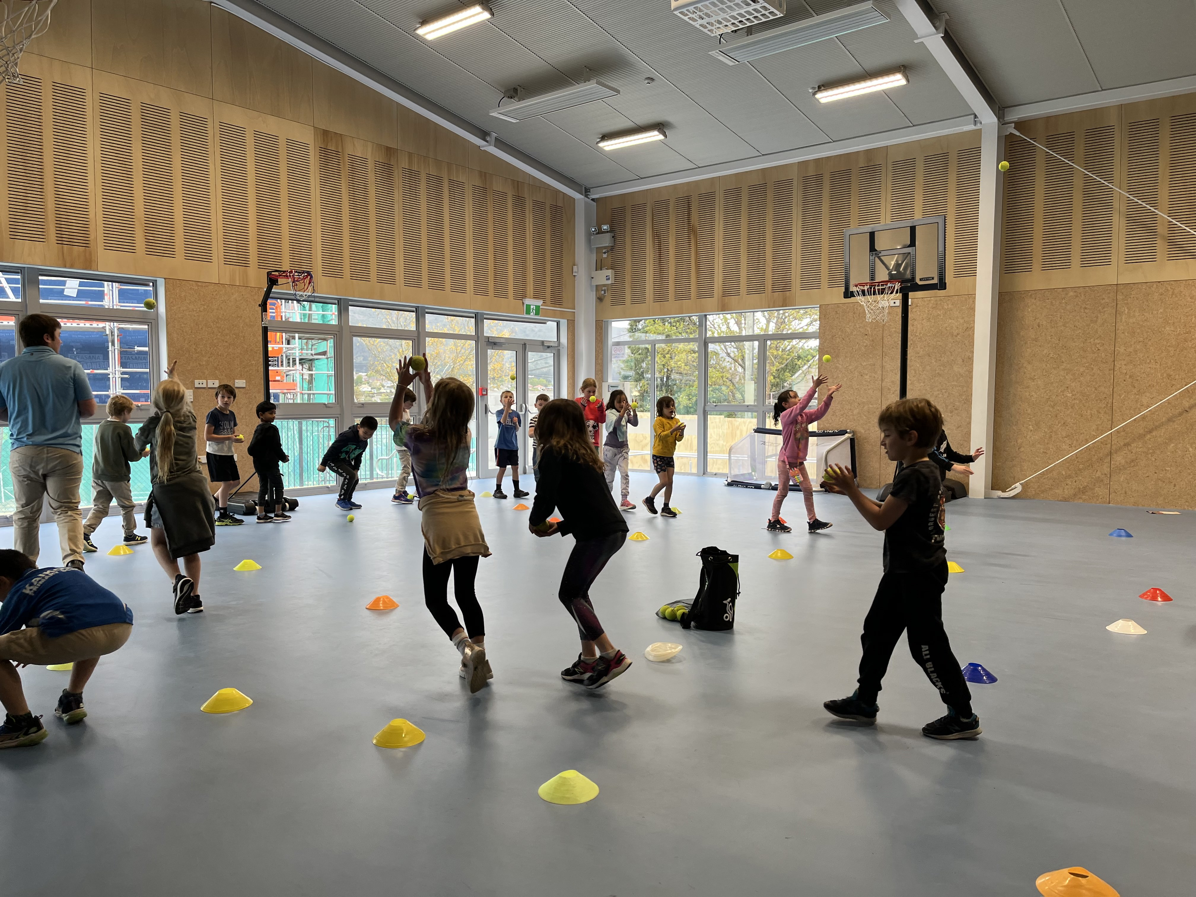 This term the Juniors have been lucky to have visits from Emily Shea, a student from Otago Polytechnic to teach us fundamental skills. Emily visits us on Monday and Friday afternoons with Rooms 5 and 6 having the first visits this week. This week we practised throwing and catching with a tennis ball.
