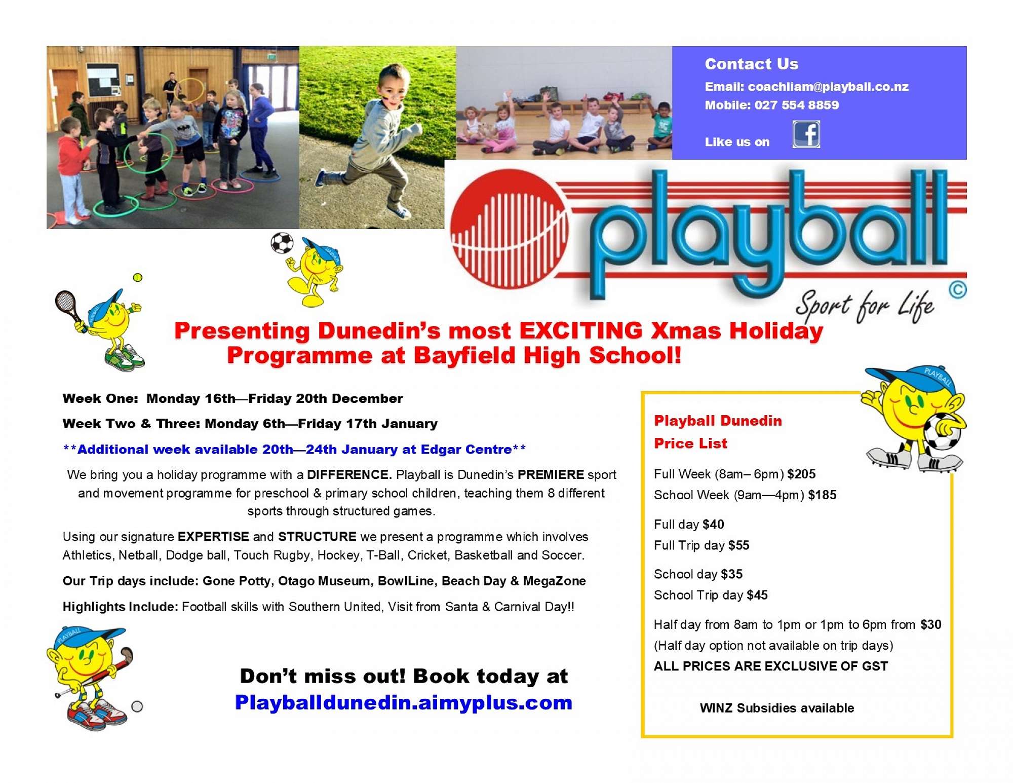 Don't forget to enrol in the Summer Playball Holiday Programme. We will be operating from Bayfield High School during the upcoming holidays 8 am - 6 pm Daily. With specialised sports clinics delivered to children via our highly trained coaches, everyone is guaranteed to have lots of fun. In addition to this, we have Trip Days to Gone Potty, Otago Museum & Mega Zone. For the full schedule and more information head to